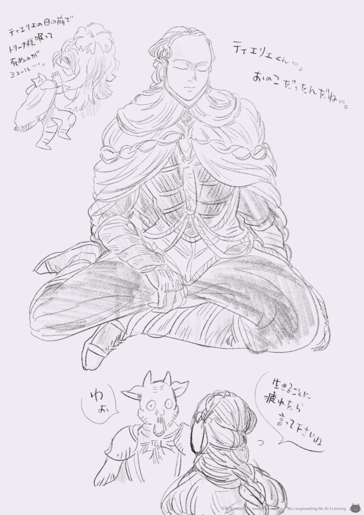 ティエリエくん毒に耐性があり過ぎて微睡むことしか出来なかったんかな。死の淵に立たないと聞こえない声…褪せ人は幾らでも黄泉がえるので適任…。